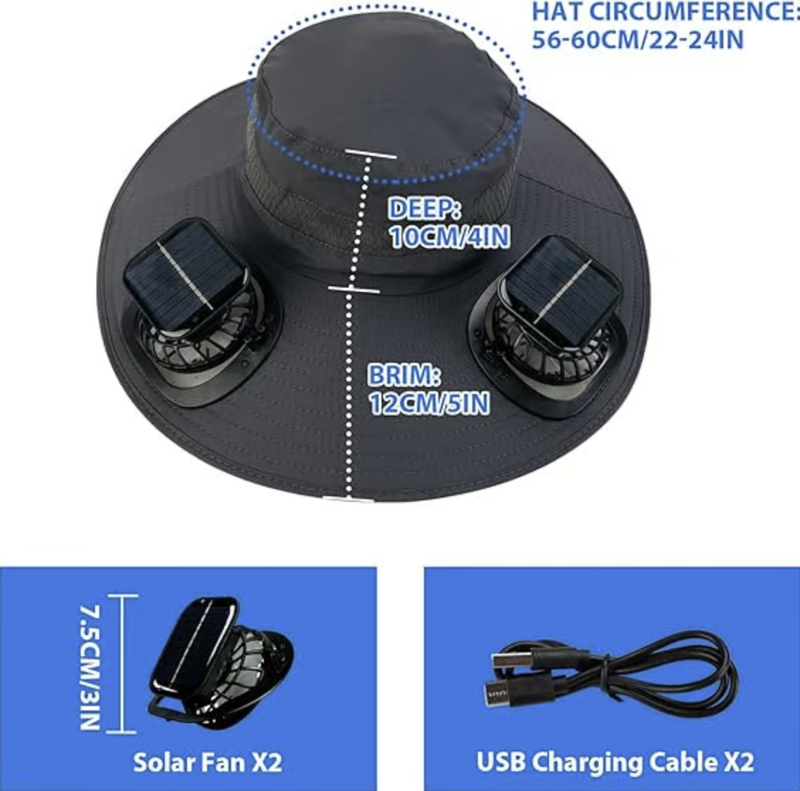 This upgraded outdoor wide brim sun hat with solar fan is designed to be worn on the head, leaving your hands free. Built in a mini fan at the front of the brim, cooling the face.