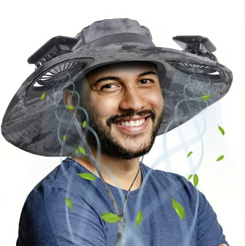 This upgraded fan hat is designed to be worn on the head, leaving your hands free.